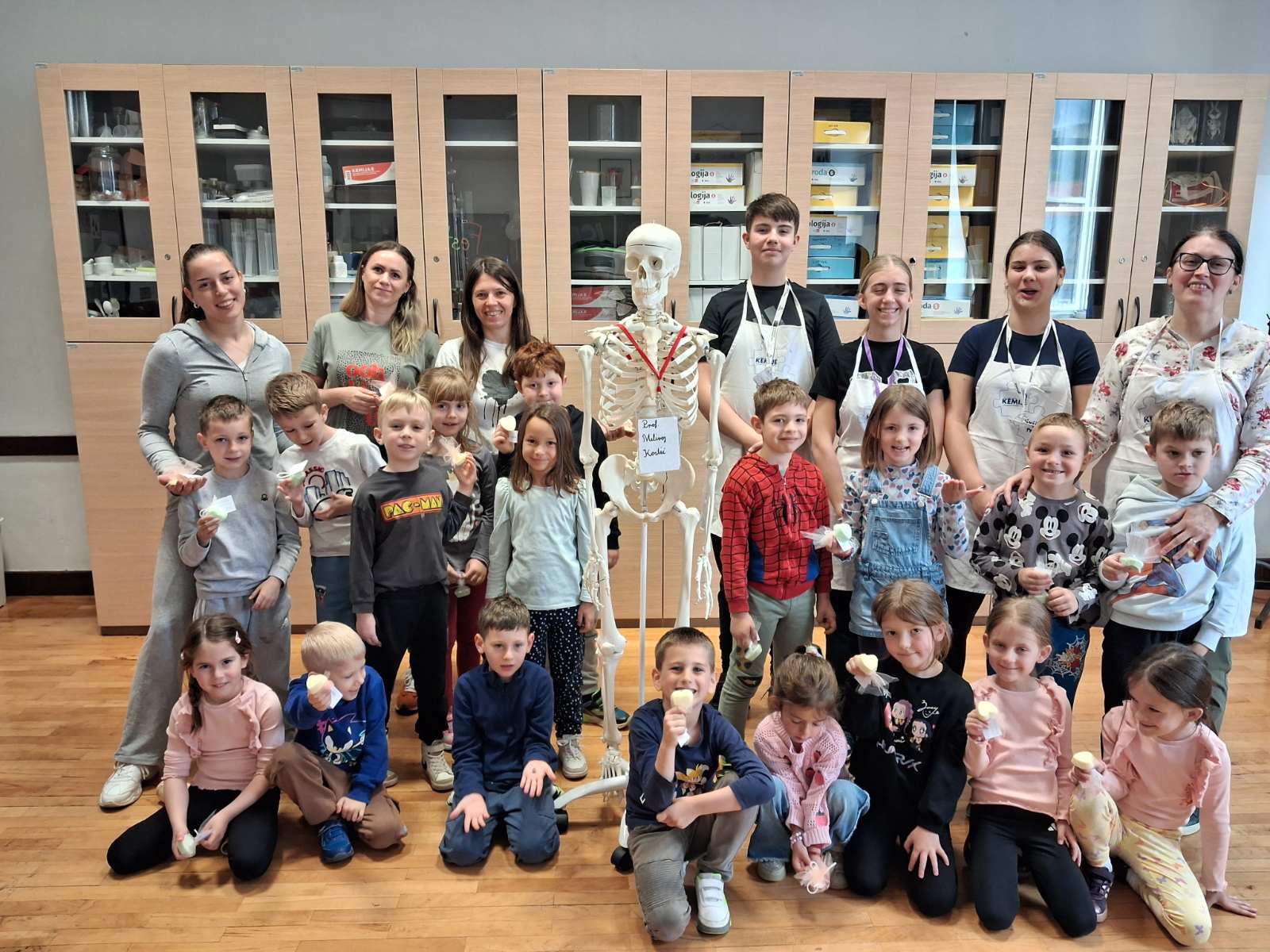 U ponedjeljak, 20. travnja našom učionicom iz Kemije i biologije su odjekivali osmijeh i uzvici oduševljenja. U sklopu Festivala znanosti ugostili smo naše male drage prijatelje predškolsku grupu iz Dječjeg vrtića Bistrac, Loptice, sa svojim tetama Kristinom i Marijom i asistenticom Idorom. Naši su im učenici, Ana Domitrović iz 8.b, Josip Puškarić i Nika Benić iz 8.c sa nastavnicom Ankicom pripremili male „znanstvene čarolije“. Naši učenici osmaši postali su pravi učitelji, te su vrtićancima demonstrirali zabavne pokuse: Slonovu pastu i Vatru na dlanu. Kroz pokuse s mjehurićima, epruvetama, nevidljivim plinom koji gasi vatru, djeca su otkrila kako znanost može biti zabavna. Bilo je predivno gledati njihove širom otvorene oči i radoznalost.