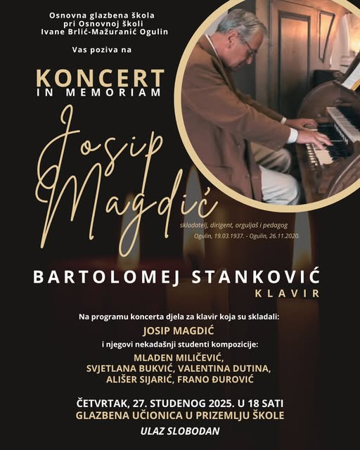 Osnovna glazbena škola pri OŠ Ivane Brlić – Mažuranić Ogulin u četvrtak, 27.11.2025. godine u 18 sati u prizemlju škole organizira koncert IN MEMORIAM Josip Magdić povodom 5.te obljetnice smrti prof. Magdića. Svi prijatelji i poznanici s kojima je prof. Magdić surađivao su pozvani.